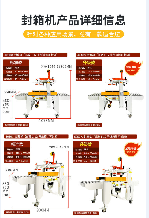 本機采用上下驅(qū)動的方式主要適用于紙箱的封箱包裝,既可單機作業(yè),也可與流水機配套使用,廣泛應(yīng)用于在家用電器、紡織、食品、百貨、醫(yī)藥、化工等行業(yè)。封箱機采用即貼膠帶封紙箱封口,經(jīng)濟快速、容易調(diào)整,可一次完成上、下封箱動作,采用印字裝置,更可提高產(chǎn)品形象。